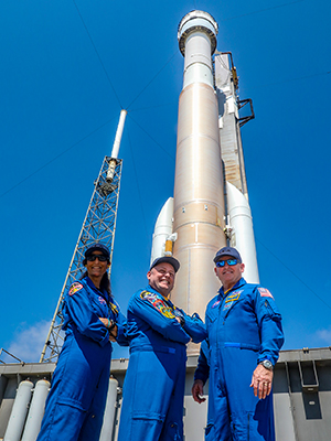 NASA astronauts Suni Williams, Mike Fincke and Barry "Butch" Wilmore stand below an Atlas V rocket topped by a Boeing CST-100 Starliner spacecraft. Image courtesy of: Boeing/John Grant